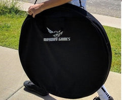 - With four pads on the bottom of the board, recessed screws to protect your table and inset eyelets for easy hanging, plus a scoring track built right into the disc storage box, this is one well thought-out board! Your board will be 30.25 inches in diameter by 3" thick and comes in a double-boxed box that is 34.5 X 34.5 X 4 Inches and weighs in at 20 pounds! Yes this is a very solid board!