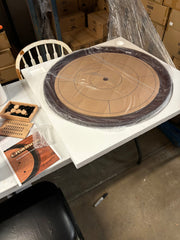 The boards consist of a 26" diameter playing surface + 2 inch ditch + 1/4 inch rim = 30.50 inches in total diameter and 3 inches thick. The game will come double boxed in a box with dimensions of 34.5 X 34.5 X 4.5 Inches and weights in at a massive 17.4 pounds (7.9 KG). Yes these are HUGE! Our boards meet the The World Crokinole Championship™ specifications which are: