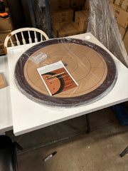 The boards consist of a 26" diameter playing surface + 2 inch ditch + 1/4 inch rim = 30.50 inches in total diameter and 3 inches thick. The game will come double boxed in a box with dimensions of 34.5 X 34.5 X 4.5 Inches and weights in at a massive 17.4 pounds (7.9 KG). Yes these are HUGE! Our boards meet the The World Crokinole Championship™ specifications which are: